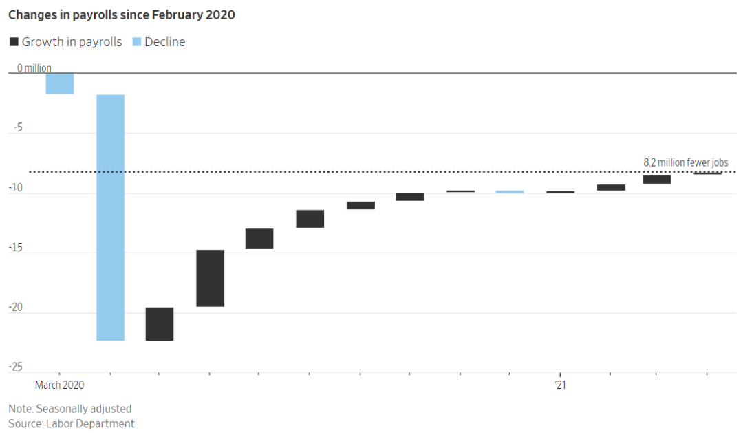 美国四月份的失业率为6.1%,三月份为6%,2月份为6.2%,1月为6.3%。看起来并没有随着去年12月底开始的疫苗接种,产生显著改善。