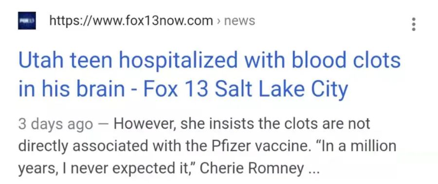 对少年的可能风险不容忽略,参与辉瑞疫苗接种(非试验疫苗)的犹他州一个17岁的孩子,打了第一针之后,因为脑血栓住院,但是他妈妈坚持称不认为这事跟打疫苗有关系,而是巧合。医院方面称CDC在调查该事件是否与疫苗有关。