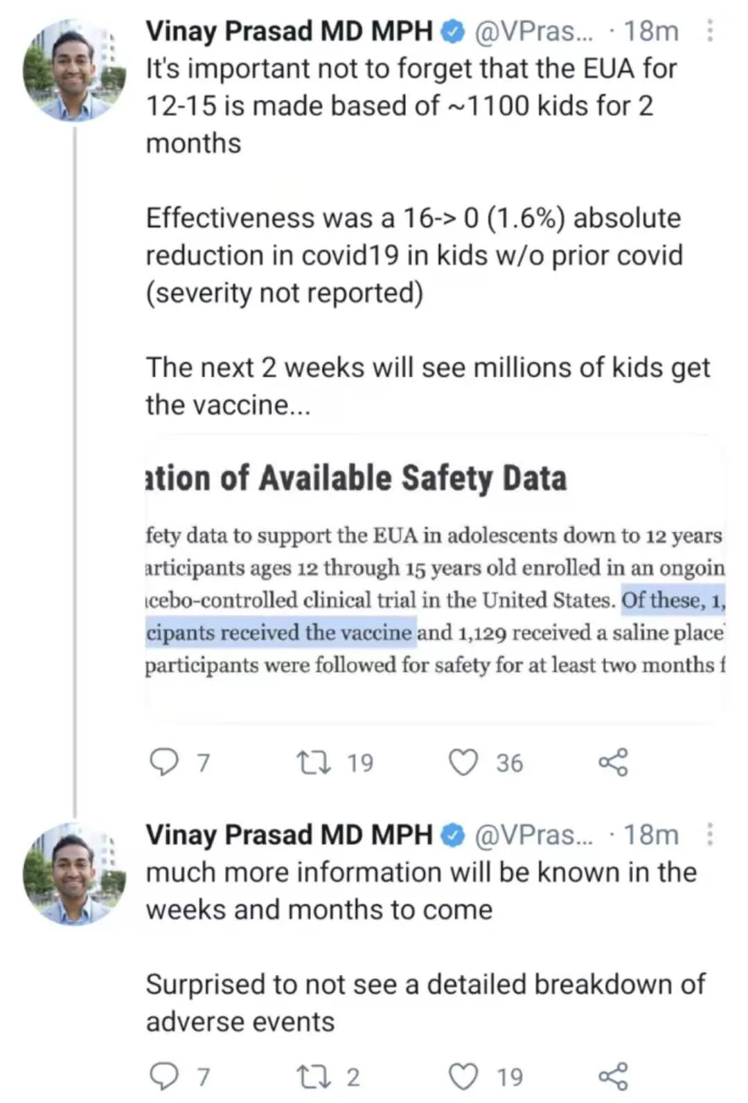 这次被紧急授权使用的疫苗,根据《华尔街日报》的报道,总共试验了2260个小孩,其中疫苗组孩子大概1100个。推特上有人吐槽,“只跟踪观察了两个月”,就获批了。