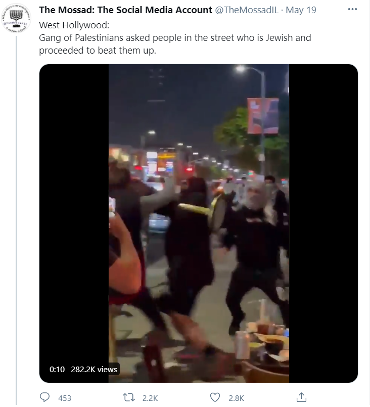 5月19日,摩萨德(以色列情报及特工组织)发推,在加州西好莱坞(West Hollywood)发生黑帮团伙寻找犹太人殴打事件。