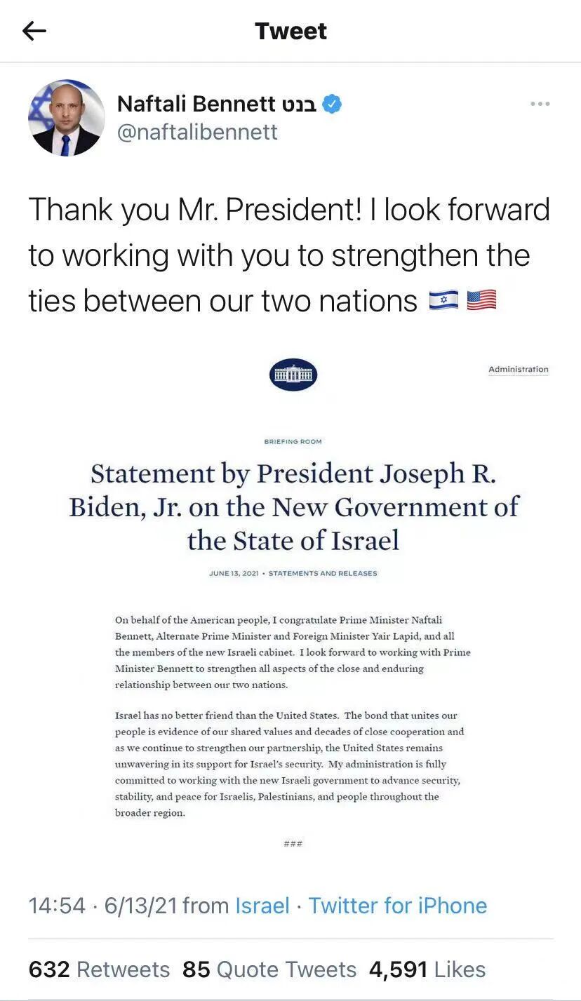 世界上首位祝贺以色列新总理的国家级领袖,则是美国总统拜登。贝内特也迅速发推表达致谢。