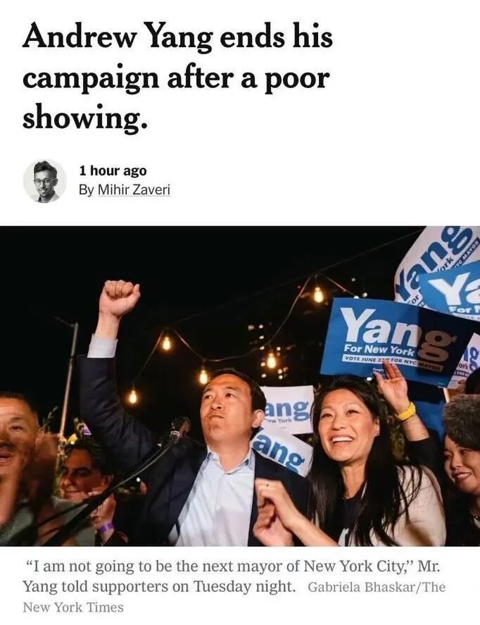 杨安泽(Andrew Yang, AY)在开票几小时后,即宣布认输,竞选纽约市长失败,初步计票结果显示他只拿到11%的票,位居第四位。