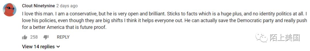“我喜欢他。我是一个保守派,但杨非常坦诚和聪明。一个巨大的优势就是他坚持事实出发,而且根本不搞身份政治。我喜欢他的政策,即使是大革新,我认为(UBI)可以帮助每个人。他实际上可以拯救民主党,并真正推动一个更好的美国,未来会证明这些。”