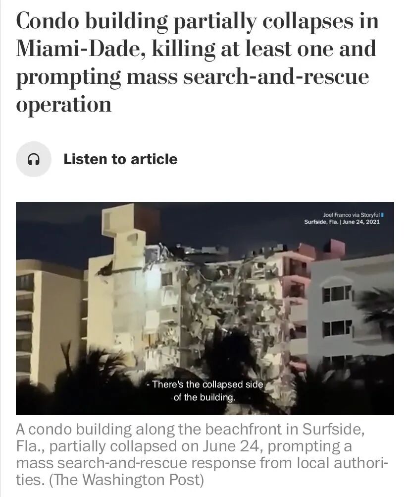 巧合的是,今天佛罗里达州迈阿密传来一则大噩耗,一栋建于1981年的12层建筑坍塌,目前确认1人死亡,10人受伤,但是至少有99人失踪。该楼有136个组合房间,其中55个受到破坏。