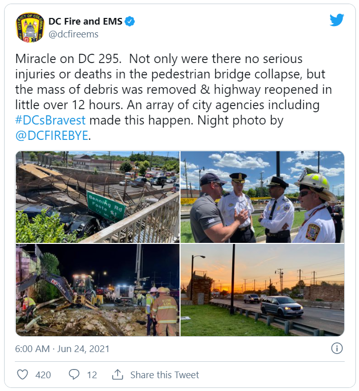 周三在DC也有一起桥梁倒塌事故,万幸的是无人伤亡,而且相关部门在21小时之内火速完成现场清理工作。