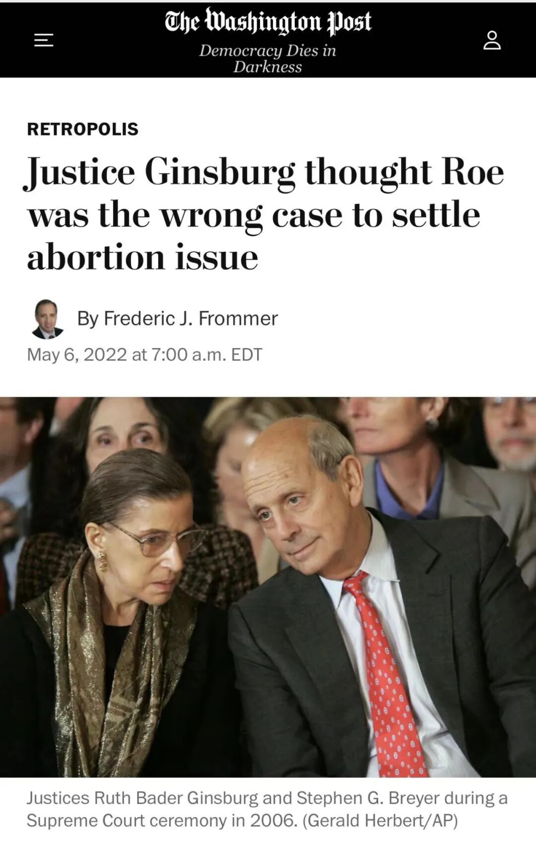 最近曝出高院最自由派的法官Ruth Bader Ginsburg也不喜欢Roe v. Wade的判决,她认为一刀切来得太突然了,应该让各州去逐渐实施。她甚至认为那样的判案导致了随后的长久抗争,她觉得应该以宪法修正案第14条而不是妇女的隐私权来审核堕胎权的问题,但是当时在此议题上未能达成一致。