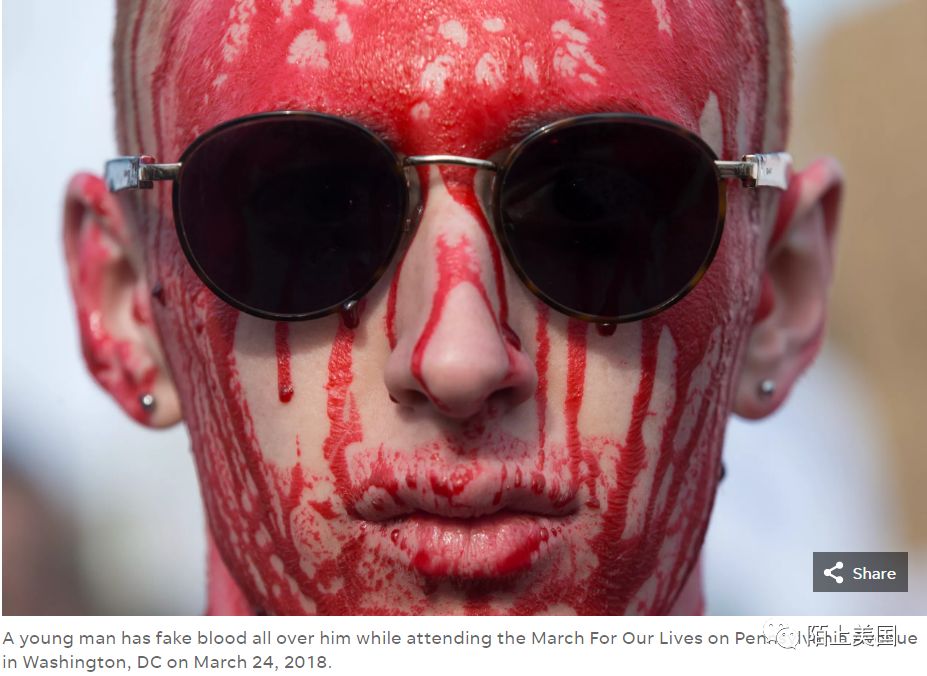 一位游行的青年用假的血液涂满了脸,让人感受到枪击生命的残酷。