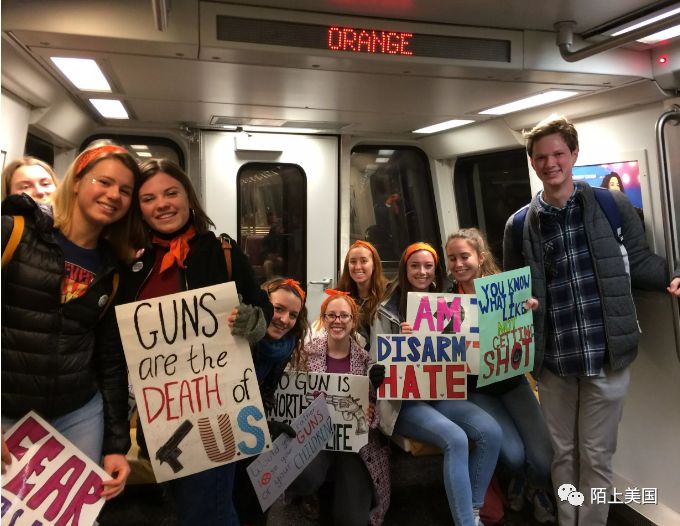 从加利福尼亚索诺玛县赶到华盛顿特区的学生们,乘坐当地橙色线地铁前往March for Our Lives集会地点。