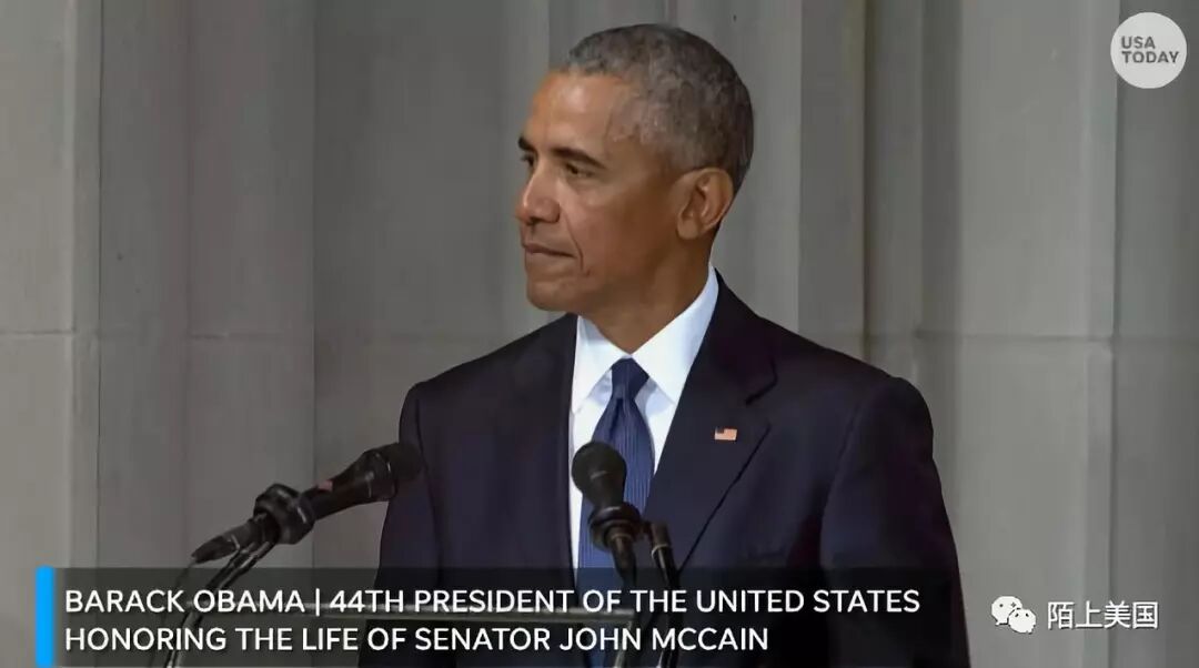 “麦凯恩认为公民的身份不是基于我们的血统、样子、姓氏是什么、父母和祖父母来自哪里,或者最近去了什么地方。” 他还提到麦凯恩在2008年竞选期间为他辩护的时候,“麦凯恩认为自己是在捍卫美国的价值观,而不仅仅是给对手辩护。”