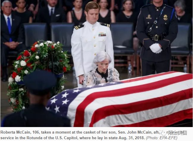 向麦凯恩遗体告别的人中,包括他106岁的母亲,罗帕塔(点击前文)。