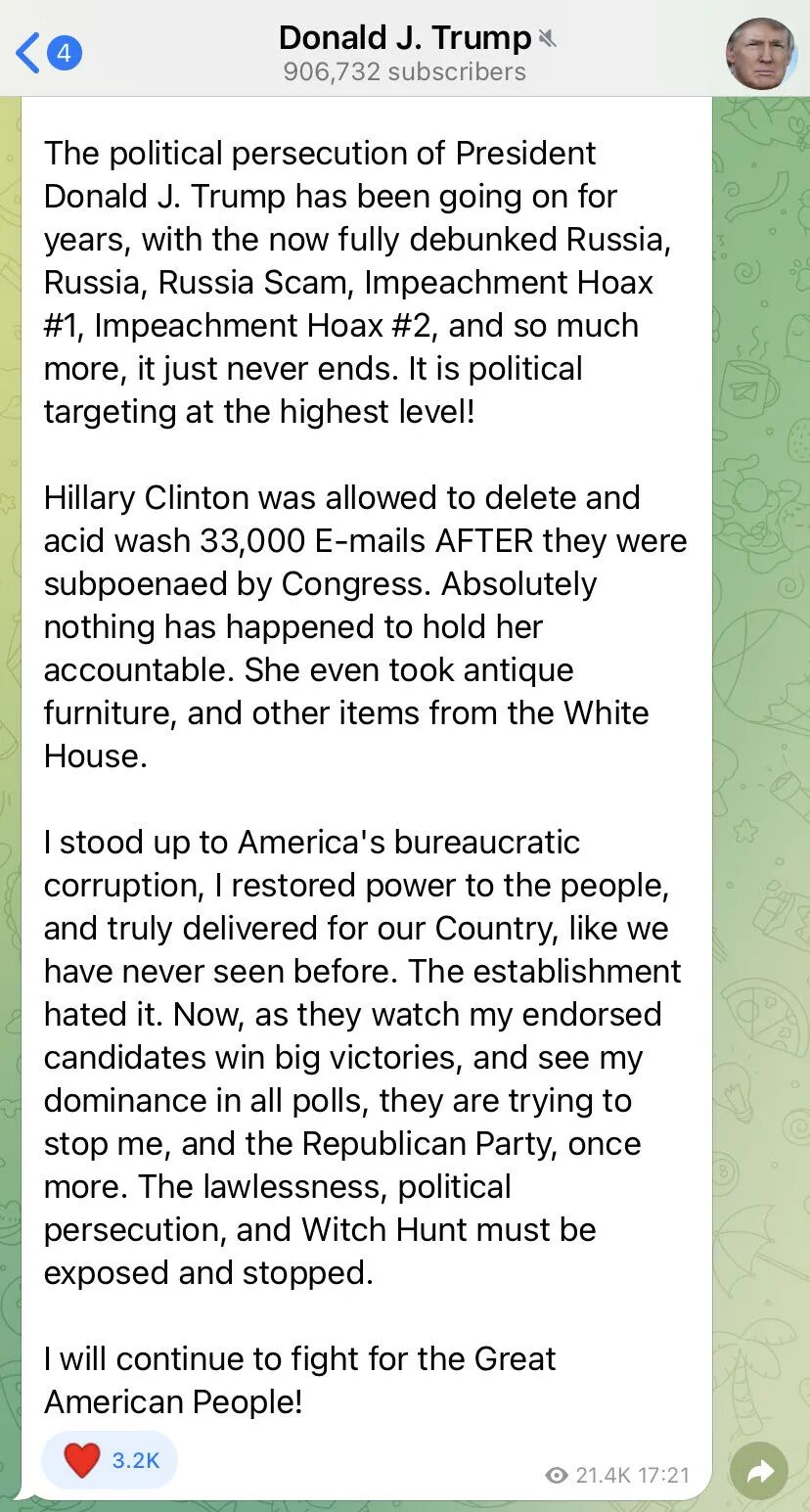 这是对起诉程序的亵渎,将司法系统武器化,是疯狂的极左势力对我发起的又一轮攻击。他们极度不希望我在2024年竞选总统,尤其最近的民意调查(让他们恐慌),他们会在即将举行的中期选举中为阻止共和党和保守党采取任何行动。
