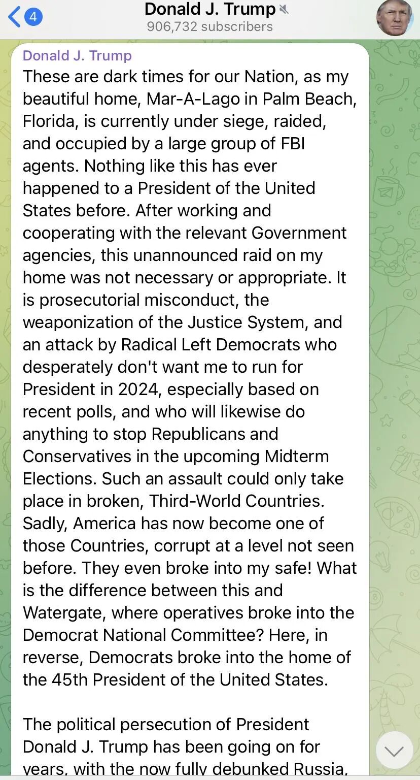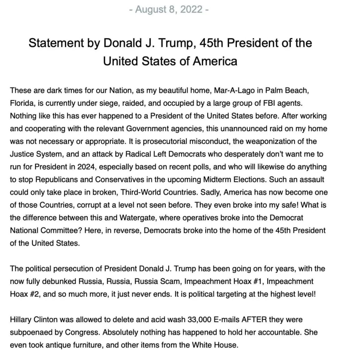 These are dark times for our Nation, as my beautiful home, Mar-A-Lago in Palm Beach, Florida, is currently under siege, raided, and occupied by a large group of FBI agents. Nothing like this has ever happened to a President of the United States before. After working and cooperating with the relevant Government agencies, this unannounced raid on my home was not necessary or appropriate. It is prosecutorial misconduct, the weaponization of the Justice System, and an attack by Radical Left Democrats who desperately don't want me to run for President in 2024, especially based on recent polls, and who will likewise do anything to stop Republicans and Conservatives in the upcoming Midterm Elections. Such an assault could only take place in broken, Third-World Countries. Sadly, America has now become one of those Countries, corrupt at a level not seen before. They even broke into my safe! What is the difference between this and Watergate, where operatives broke into the Democrat National Committee? Here, in reverse, Democrats broke into the home of the 45th President of the United States.
