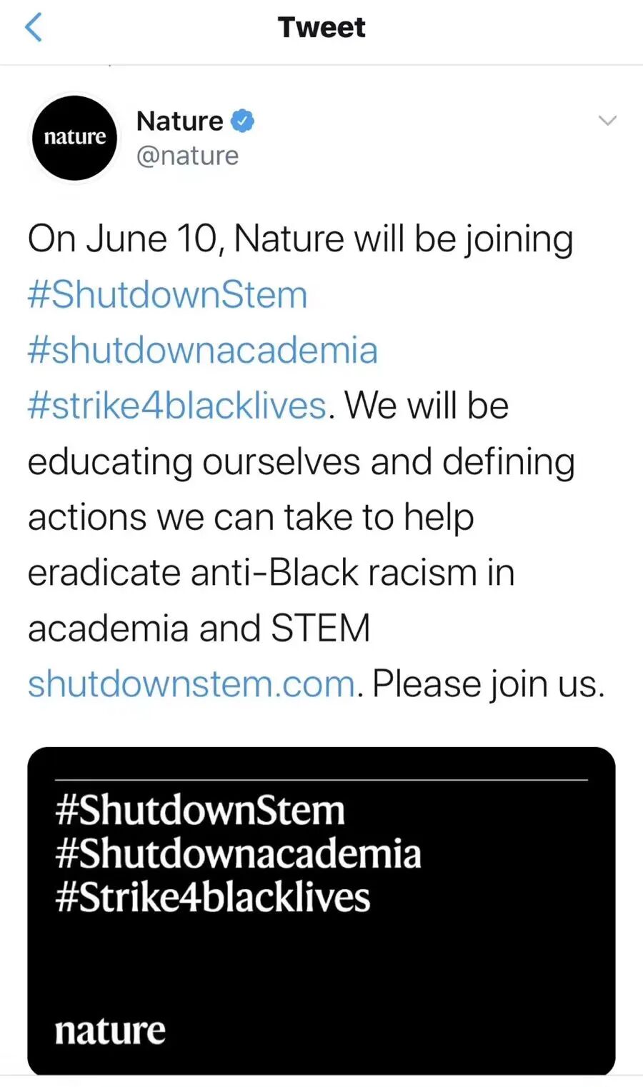 理工科学类(STEM)和教育界,正在发起一场以罢工为形式声援BLM的运动。《自然》杂志表示,6月10日这天他们的所有员工将加入主题标签为:#ShutdownStem(停工STEM), #shutdownacademia(教育界停课)的行动,以表示对反对针对非裔的歧视的支持。