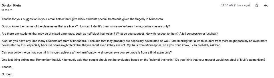 谢谢联系,表达因为明州乔治事件,希望对非裔学生成绩特殊照顾的请求。不过如何通过名字知道哪些是非裔,毕竟现在是网络授课,我如何确定这个?如果有学生是混血,比如父母中一个非裔一个亚裔,你有何好建议,我是不是该给这种情况的一半成绩优待?此外,你是否知道哪些学生来自明州?我猜他们或许都均等地受到了冲击。我甚至怀疑那里来的白人学生有没有可能受到更多冲击。比如根本不是种族分子,现在却被当成种族分子?我的助教倒是明州人,所以如果你不知道情况,我可以问问她。鉴于这门课只依赖一次考试评分,你对于课程打分上的平等公正有没有更好建议?最后问一句,马丁路德金博士说不要按肤色评判人,你的建议是否恰好违背了他的理念?