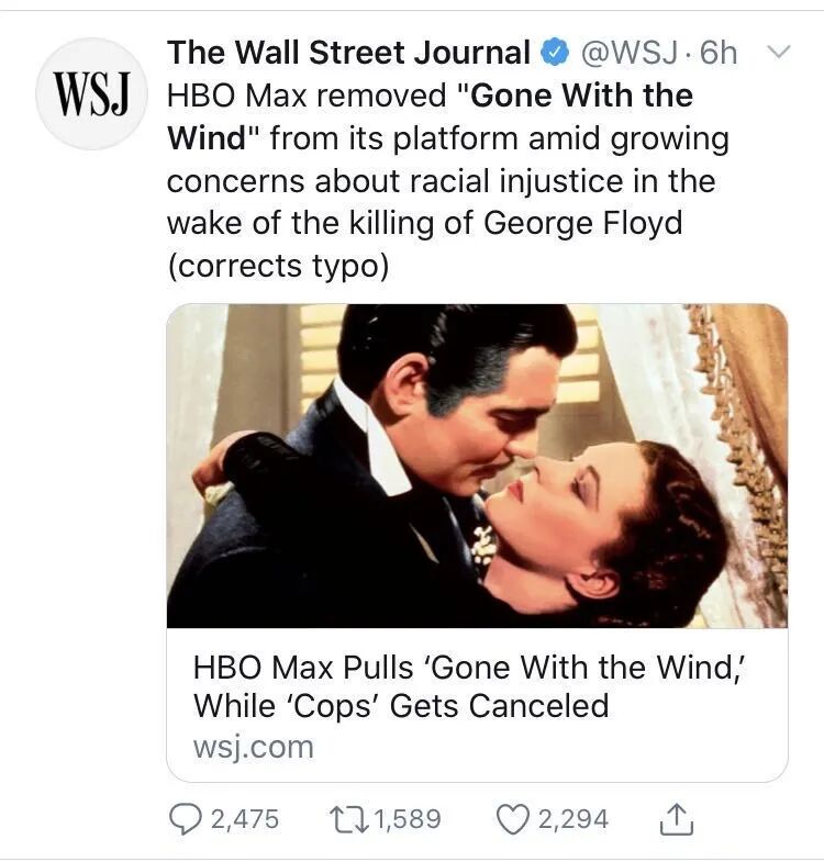 直到今天,看到了这个新闻:美国在线电视公司HBO Max暂时下架了《乱世佳人》(《飘》),两个正面描绘警察的真人秀节目,《警察》和《警局实拍》也被有的在线文娱平台彻底或者暂时下架。