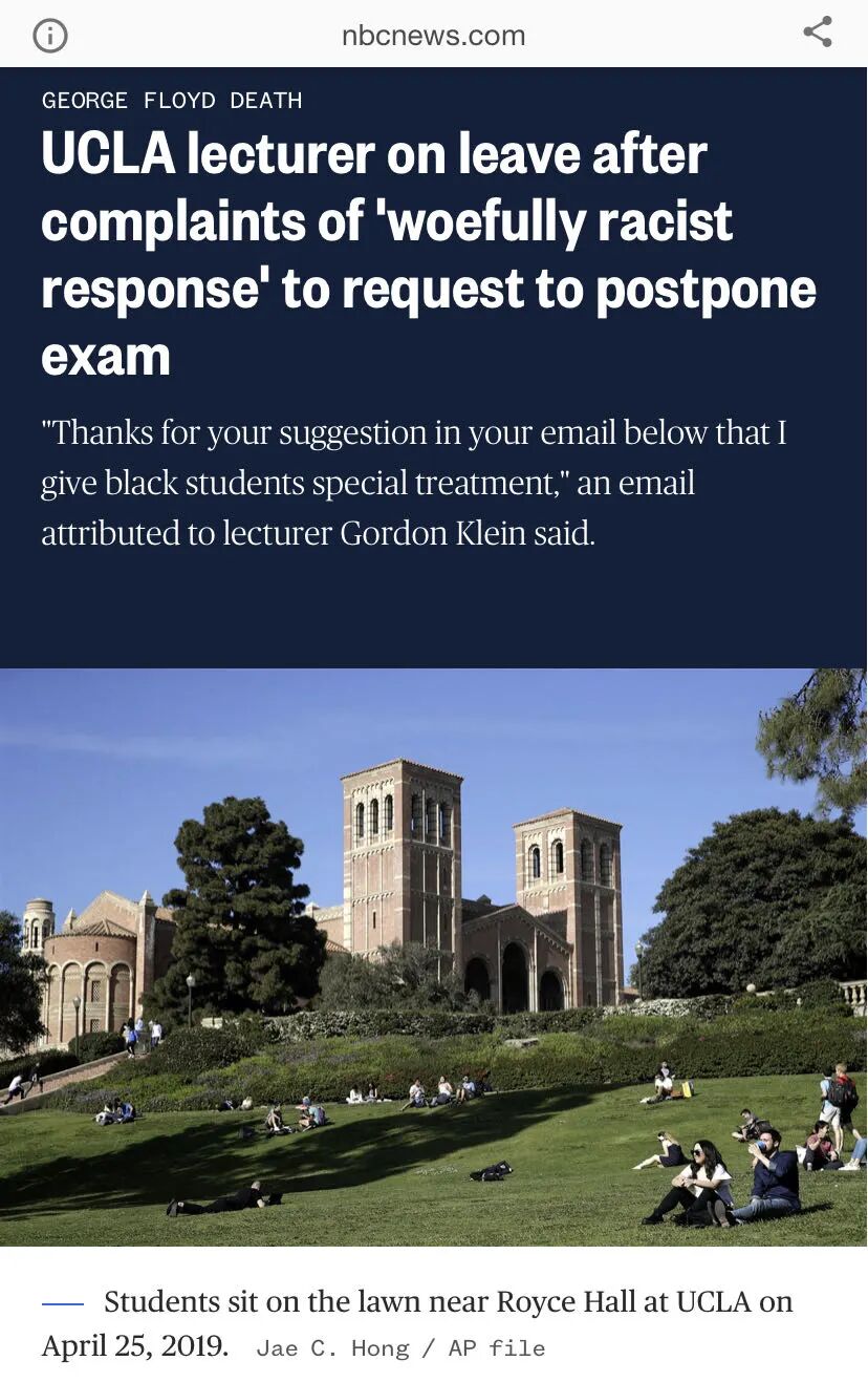 这么说不是危言耸听,今天另外一则新闻引发广泛关注。美国著名大学加州大学洛杉矶分校的一位担任讲师的教授,戈登·克莱恩(Gordon Klein)被停课,其课程由其他老师代理。理由是被投诉他有“可悲的种族言辞”。(注:没想到2年多后,会在MIT FSA的会议上遇到这人,详情前参考文:🔗见证一个教授打败机器赢1000万美元官司的机会)