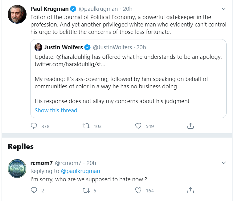 其中一项运动就是,弹劾芝加哥大学经济学家哈拉德·乌利格(Harald Uhlig)担任的政治经济学杂志( the Journal of Political Economy)编辑的职务。克鲁格曼的理由是乌利格的政治立场造成学术角度上压制了对BLM的支持,而乌利格对“撤资警局(defund police)”的反对更让克鲁格曼恼火。