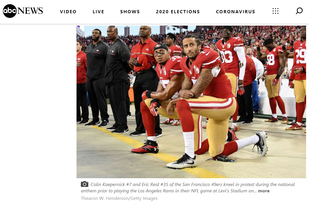 源自旧金山49人队的四分卫科林·卡佩尼克(Colin Kaepernick)在比赛奏国旗环节选择了坐下,被非议后改为单腿下跪,以抗议对非裔的歧视。