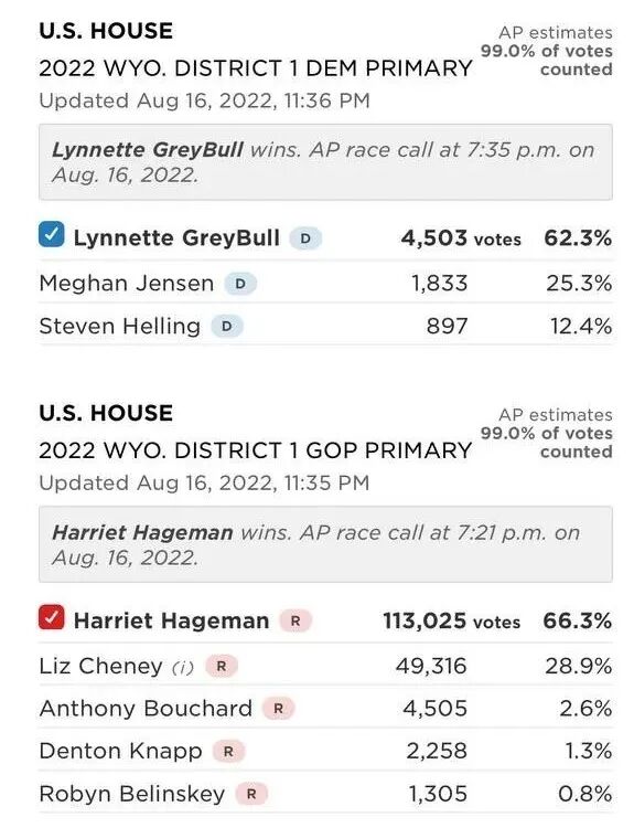 其中怀俄明州的共和党现任国会众议员、1/6国会事件调查委员会副主席、反川建制派丽兹·切尼(Liz Cheney),与川普背书的候选人律师哈里特·哈格曼(Harriet Hageman)之间的较量,尤为瞩目。