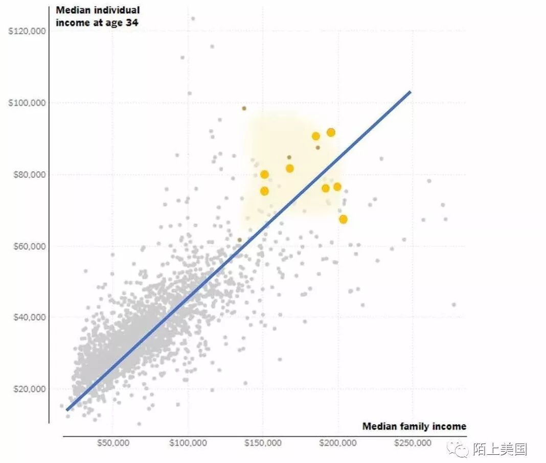 二,藤校(八个橙色圆圈代表的学校)都在这条线上下不远。这说明:藤校毕业生收入高,几乎完全可以用他们父母的高收入来解释。换句话说,进藤并不是他们收入高的原因。