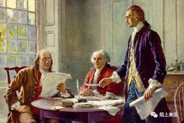 国父们杰弗逊(右)、富兰克林(左)和亚当斯(中)共同草拟《独立宣言》