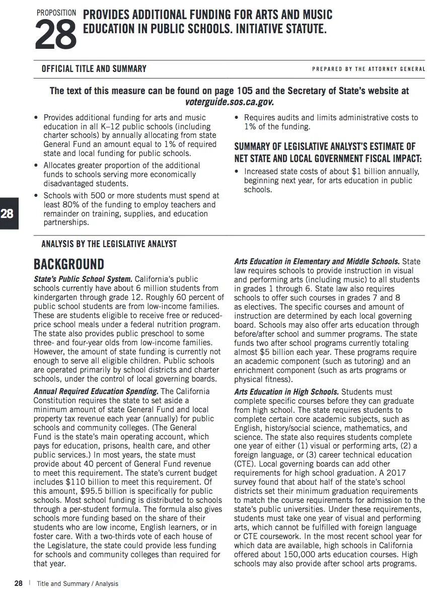 【摘要】继1988年加州的Prop98法案强制拨款40%到教育部门、2013年的LCFF拨款模式将部分地产税纳入General Fund、并从General Fund里拿出更多拨款给教育部门之后,本次2022年选举,由教师工会捐资,加州公投Prop 28再次要求将每年加州税收General Fund的1%,即10亿,强制拨款到K-12的艺术和音乐教育。这部分拨款在原本的教育部门拨款中,但由于日益繁重的教育部门的福利、养老金的重负,很多学校和学区砍掉了艺术、音乐课程。对prop 28,我们的朋友投稿发表了自己的看法。