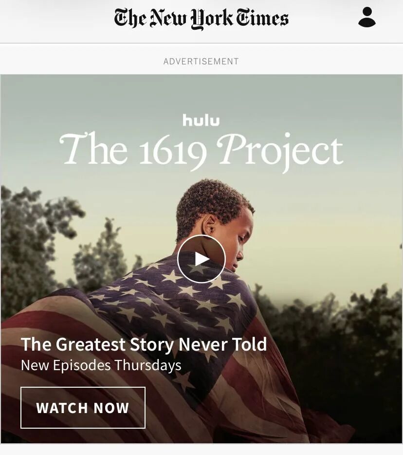 现在的美国,"白人至上"真成了一个筐,所有社会问题都可以往里面装,尤其是非裔的一切问题,基本都优先推给白人负责;同时极左还有另一种趋势,这个国家但凡正面的历史,那么首先要用“1619工程”讲非裔对美国的“建国大业”这类故事新编的手法。在纽约时报这个美国发行量第一的报纸,很容易撞到这类广告。