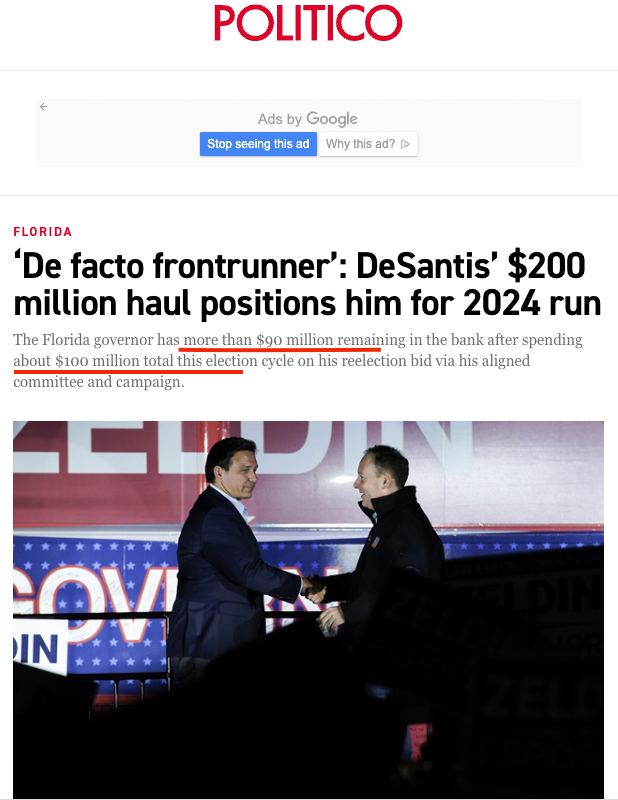 德桑蒂斯在2022年中期选举给佛罗里达州带来了惊人的红潮,大胜了18%,也为共和党普选选票超过民主党500多万票立下功劳。但是很多人没有注意到的是,他州长竞选,花了1个亿。