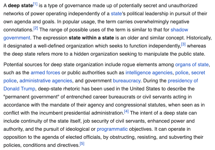 “深层政府是一种由潜在的秘密和未经授权的权力网络组成的治理类型,这些权力网络独立于国家的政治领导层,为追求自己的议程和目标而运作。在流行的说法中,该术语带有压倒性的负面含义。该术语的可能使用范围类似于影子政府。是一个较旧且类似的概念。从历史上看,它指的是一个定义明确的组织,寻求独立运作,而深层政府更多地指的是一个寻求操纵国家公众的隐藏组织。