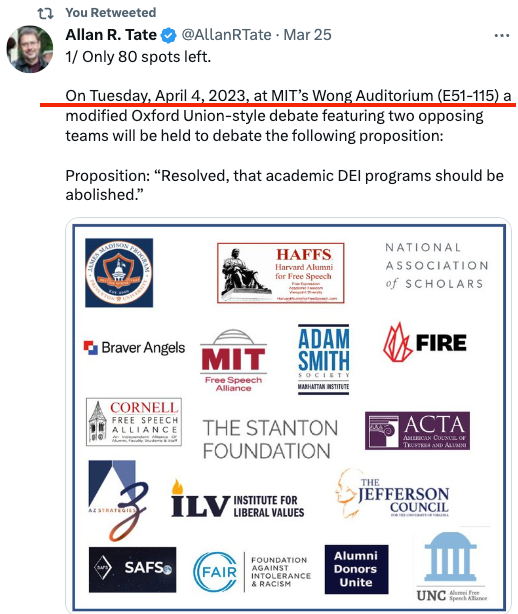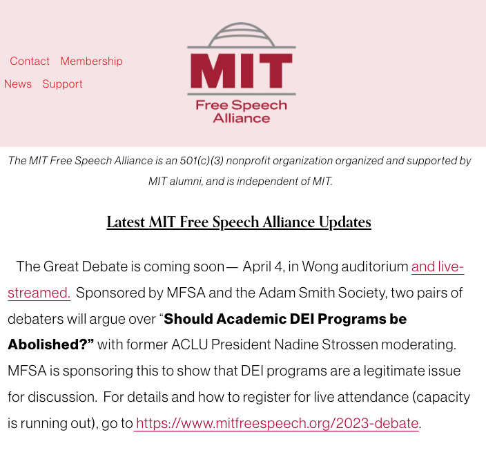 中邪的地方太多,一个个抢救不过来,大家伙先帮忙盟友MIT言论自由联盟(MIT Free Speech Alliance,MFSA)捍卫住MIT的言论自由吧。请关注参加或者在线参加将于4月4日在MIT Wong Auditorium举行的DEI大辩论。更多信息请去MFSA的主页了解。
