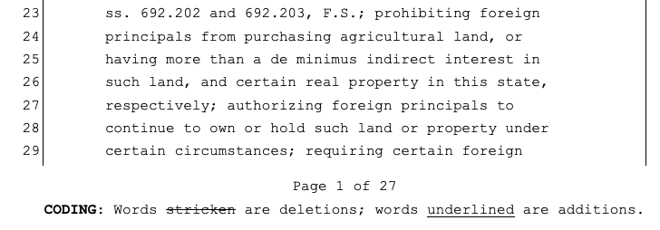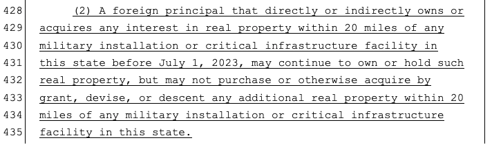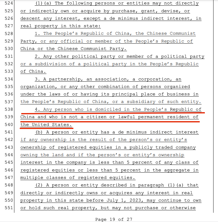 首先这个法案的重点是限制外国购买农地和特定的房地产(certain real property),而不是限制所有的房地产。还有“特定的房地产”指的是,距离佛州军事和关键基础设施20英里以内。但是被一些流量号一扭身就误导成了,好像专门为了“限制中国人买自住房”搞的精准立法。