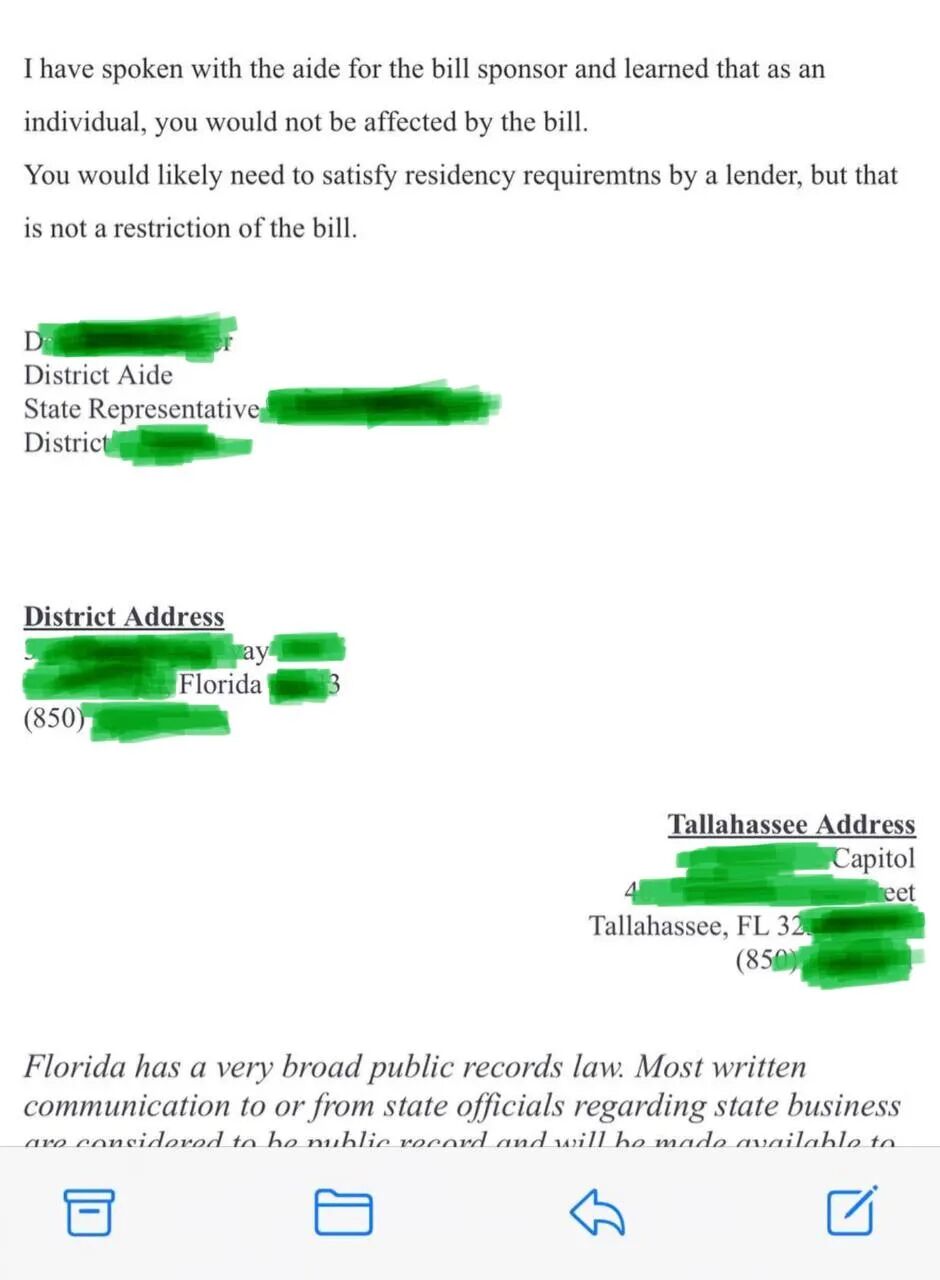 州众议员办公室回复说:“我询问了该法案的起草人,获悉作为个人,将不会受到该法案的影响。你在贷款的时候也许会遇到贷款方对居住条件有要求,但是那属于与该法案要限制的范畴无关的事。”