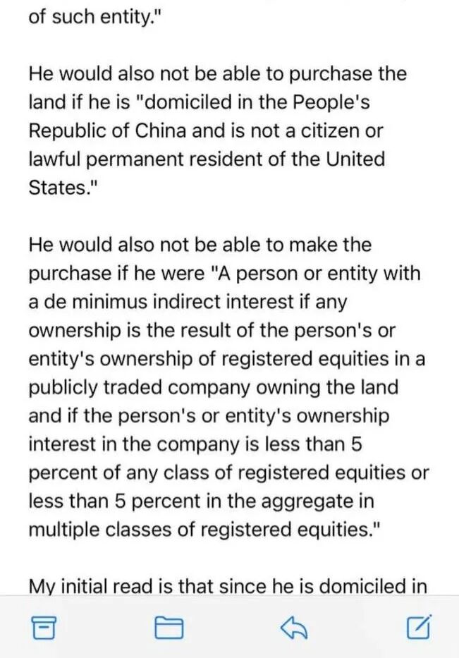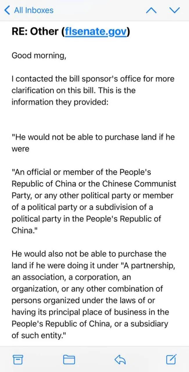 前面两页的回复都是摘录自法案原文的一些部分,重点是第三张email截图的回复,“我的最初理解是,由于他(H1B之类的签证持有者)是居住在美国,因此除了党员之类的情况,其他并不受到限制。