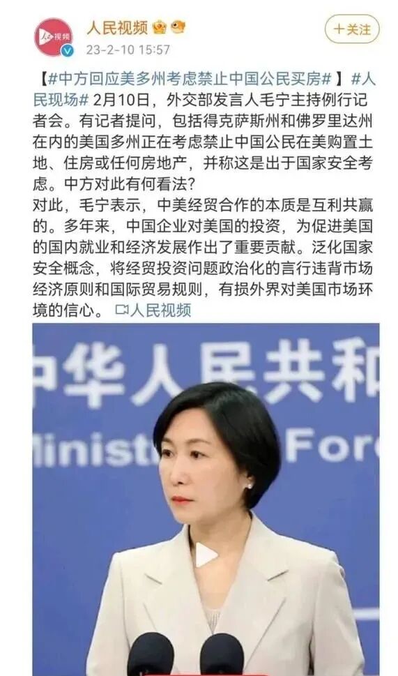 而中国外交部发言人也表态过反对德州、佛州此类限制对美国不友好的国家买地的法案。