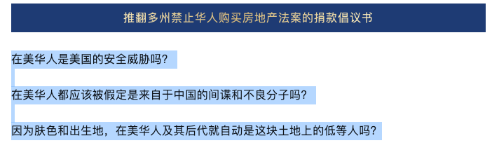 吆喝捐款的这个律师联盟组织,几个月前就开始就此事发过找华人伸手要钱的文章,一开篇就是针对“在美华人”喊话,问题是佛罗里达州刚刚通过的法案很明确不是针对在美国有合法签证的任何人,针对的是让美国担忧的多个国家政府,限制他们在美国买地,为啥要把我们这些法案影响不到的在美华人绑上你们的战车?这里明确表态,拒!绝!被!绑!架!