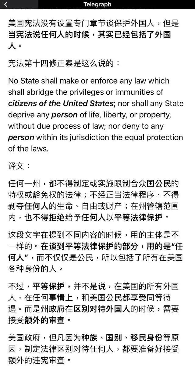 本文想说的是,这是一个微信的错误宣传。不是什么情况下宪法第十四修正案都会绝对保证非公民要跟公民待遇完全一模一样的。