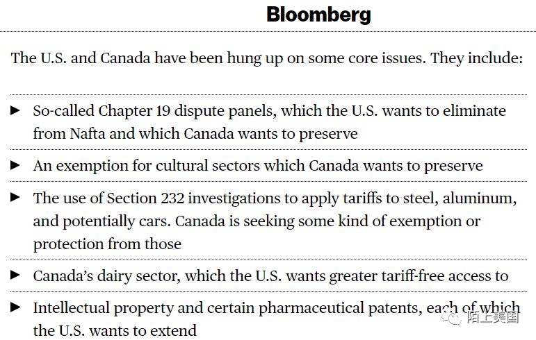 根据《彭博社》的报道,美加谈判的重点集中在: