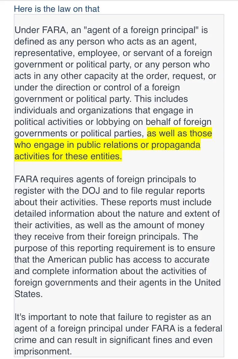 美国的FARA法律要求,帮助他国做游说的实体需要去美国司法部注册,并且定期汇报自己的操作和行动,否则属于违法重罪,将受到重罚,主要负责人也需要坐牢。法律不容亵渎。