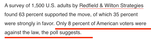 63%的美国选民支持该法案,其中35%的强烈支持,而反对这个法案的选民仅8%。