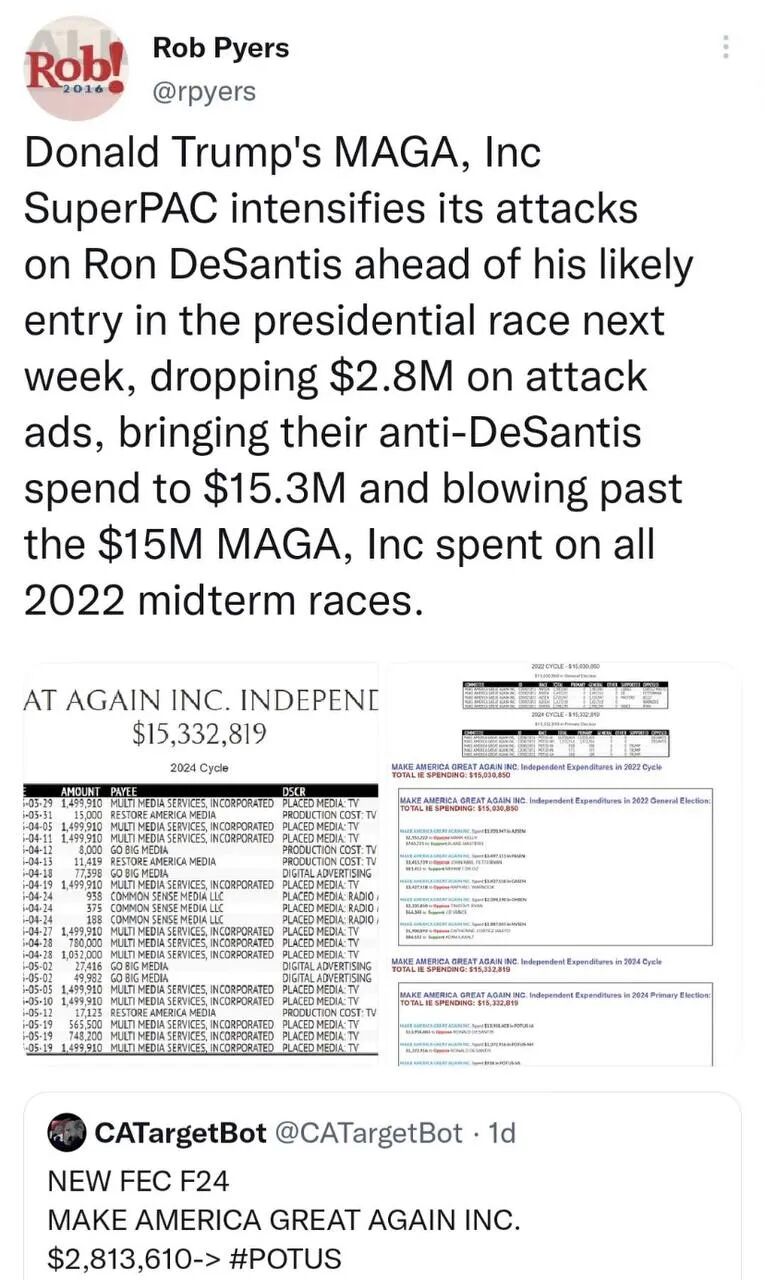 川普显然也一点也不轻敌,到目前他的MAGA超级PAC投入在攻击德桑蒂斯的广告花费上,已经达到1500万美元,超过该超级PAC在2020年中期选举中的投入。