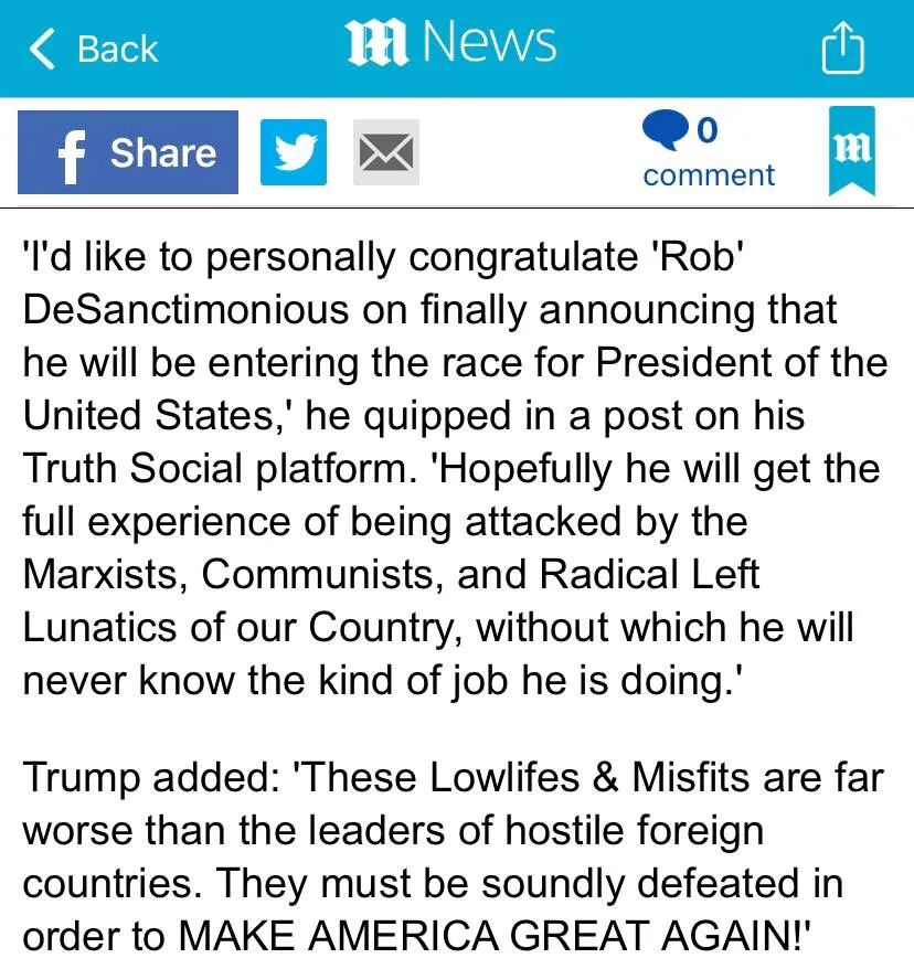 而此前的2017年,做国会议员的德桑蒂斯提出过一项立法,要求在当年11月之前终止为穆勒对川普总统的调查提供资金。川普也肯定过德桑蒂斯在国会两次被左翼操控的弹劾中对自己的支持。