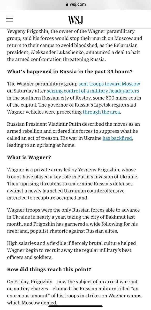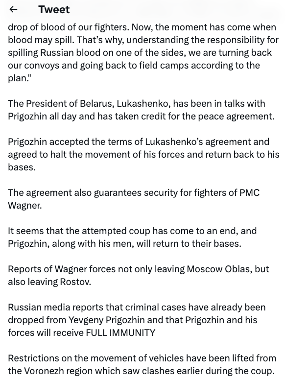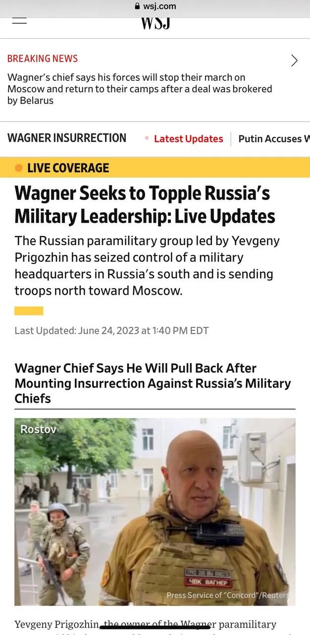 眼看着箭在弦上,但刚刚的转变又非常戏剧化,在白🦢🔩总统出面跟厨子调节,为了避免正面流血冲突,他们达成了“和平协议”,瓦格纳集团已经停止朝莫斯科前进。