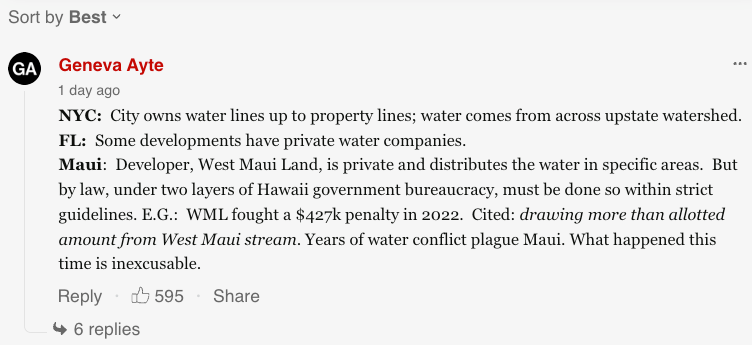 NYP该报道下面最高赞的留言爆料指出,“在毛伊岛,开发商西毛伊岛土地公司 (West Maui Land) 是一家私营企业,负责在特定区域分配水资源。但根据法律,在夏威夷两层政府官僚机构的管辖下,必须在严格的指导方针内操作。例如:WML在2022年面临42.7万美元的罚款,原因是:从西毛伊岛河流中提取的水量超过了分配的水量。”