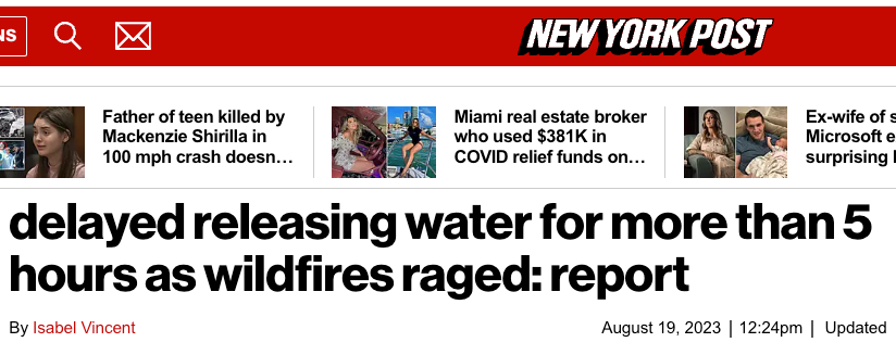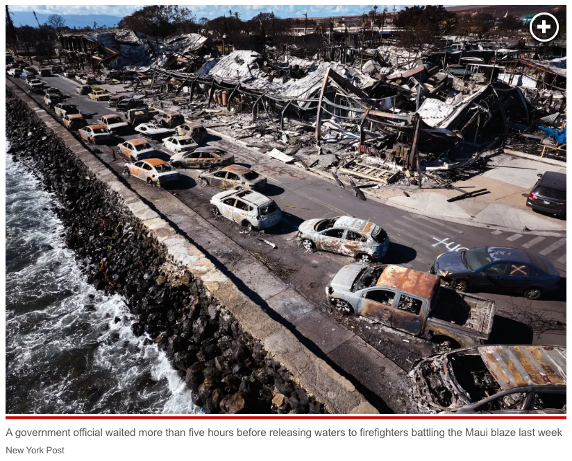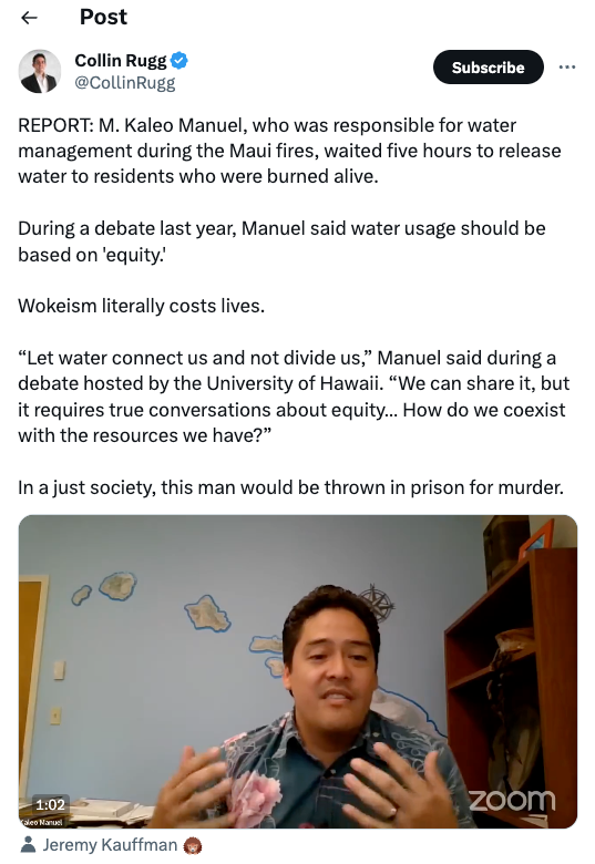 火灾发生时候,当时当地居民迫切需要供水来阻挡火灾。但是夏威夷州水务官员卡莱奥·曼努埃尔(M. Kaleo Manuel)却推迟了向当地农民放水至少5小时!曼努埃尔的委员会拒绝了将溪流引向受灾严重的拉海纳地区地主水库的请求,直到野火肆虐失控。此人是个woke(极左)思维的教条主义,他在一次由夏威夷大学主持的辩论时说,水的分配使用需要遵循“结果平等(equity)”的思路。