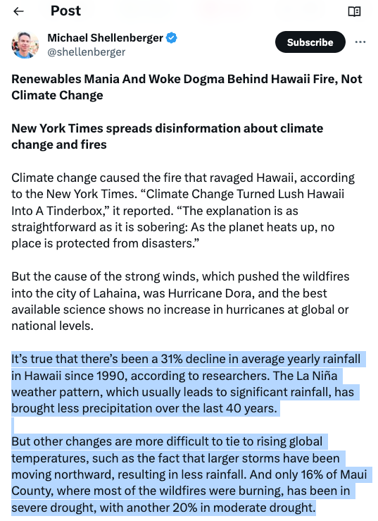 一般左翼媒体遇到此类事件,会推出气候变化,认为是导致夏威夷毁灭性火灾的头号杀手。是如此吗?