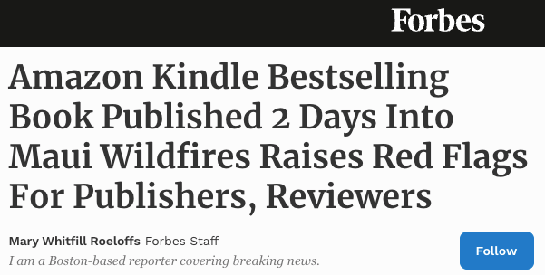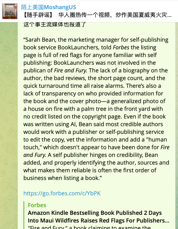 至于昨天辟谣的🔗夏威夷大火发生两天就有书出版的事,其实主流媒体一样有报道。这个书第一版是8月10日上架,现在美国任何人自己要出书挂到亚马逊卖非常容易,不少还是用ChatGPT这类AI工具写出来的,通过人工或者计算机智能几天内弄出一本十几页几十页的书实在不是难事。