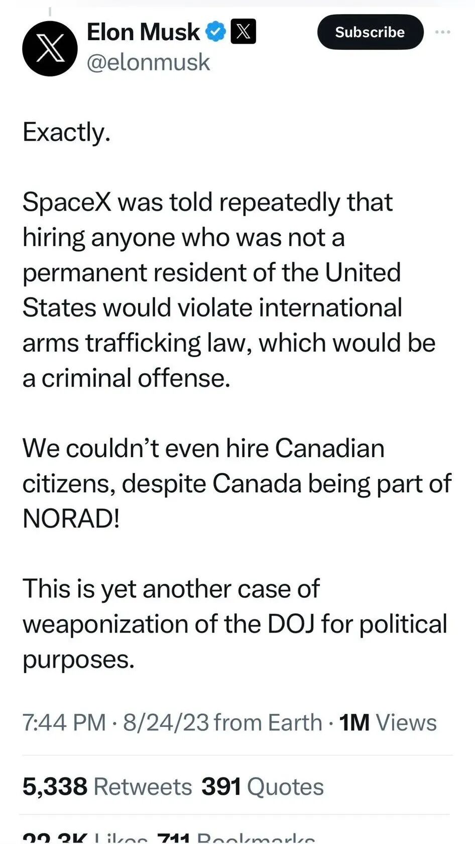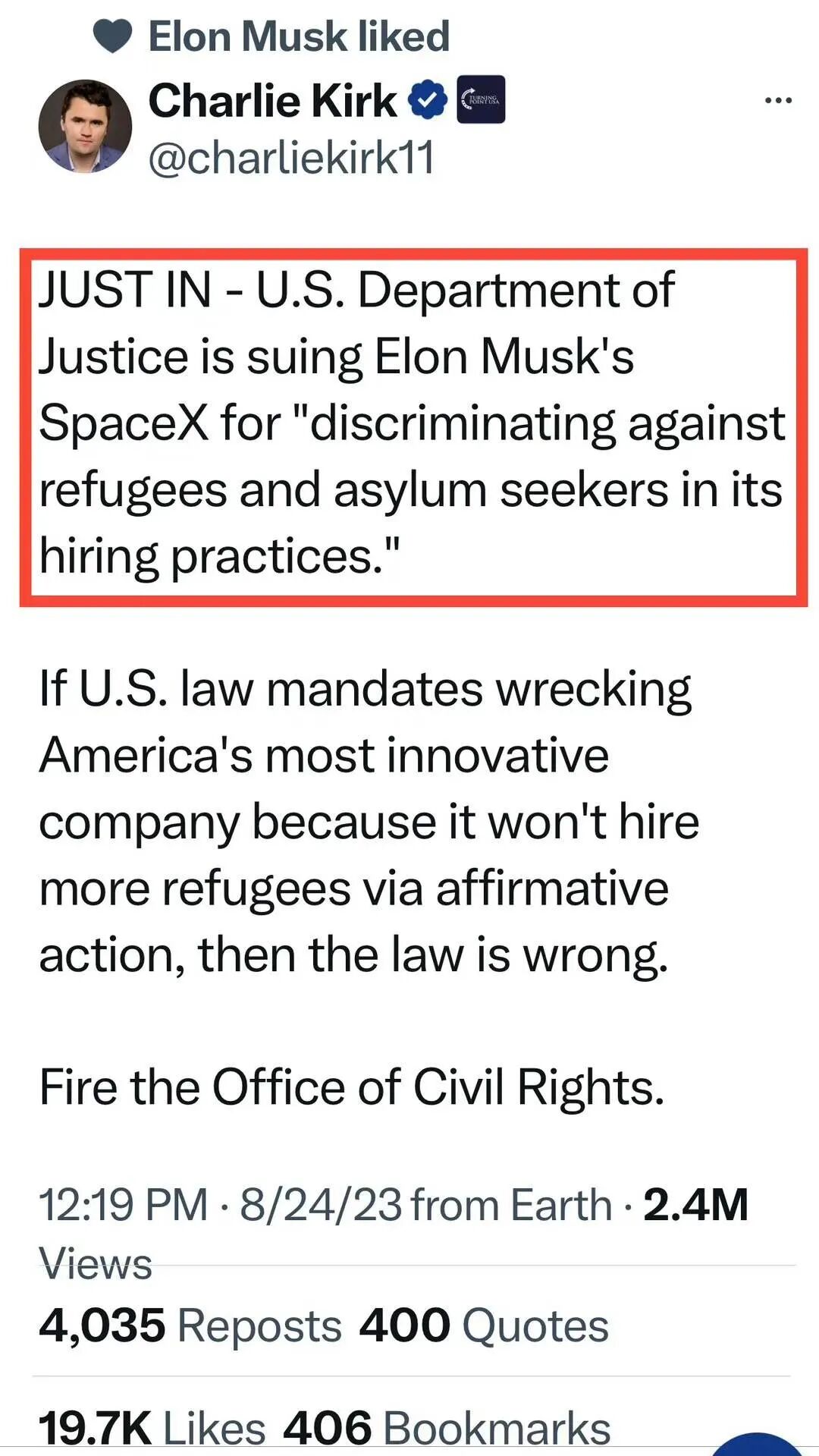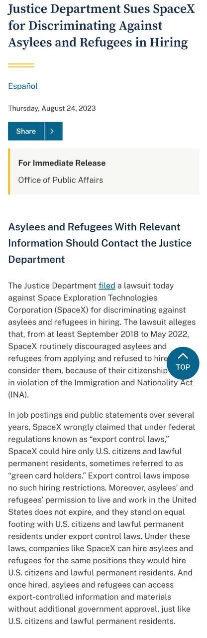 这两天还有一个新闻,腐败的司法部,要起诉Musk的SpaceX只雇用公民和绿卡,不雇佣难民和避难身份的人,完全政治化公器私用!