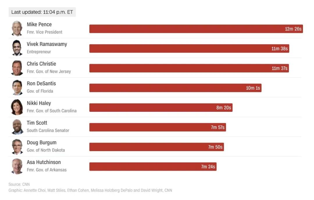 从辩论后各候选人公布的捐款入账也可以看出来Vivek是大赢家,所有参加辩论的8人中只有DeSantis跟Vivek在24小时内获得超过百万美元的竞选捐款。目前川普团队暂未公布过去24小时的捐款数据。顺便提一下,川普在周四未出席首场辩论,而Tucker Carlson对他的访谈在同一时间在推特(已改名X)上播出,创造了自媒体同类访谈的世界纪录,不到2天突破2.5亿人次的点击。