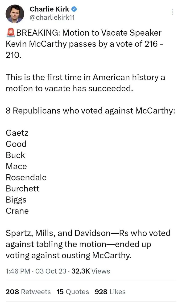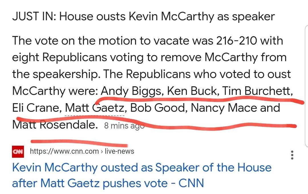1小时后,行为艺术家们如愿以偿,众议院以216:210的结果,通过驱逐投票,麦卡锡成为美国历史上首位被这样ousted(驱逐)的议长。这一轮投票,跟全体民主党站在一起的从11人减少到8人,他们是: