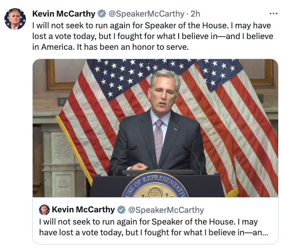 美国首次发生议长(speaker)被驱逐事件,并且麦卡锡宣布也将不再竞选该美国第三号政治人物的位置。